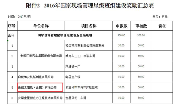 通威太陽(yáng)能(合肥)有限公司喜獲2016年國(guó)家現(xiàn)場(chǎng)管理星級(jí)班組建設(shè)獎(jiǎng)勵(lì)