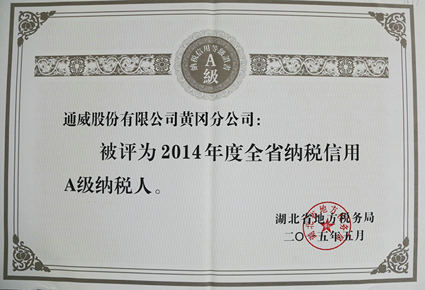 黃岡通威榮獲湖北省“2014年度全省納稅信用A級納稅人”