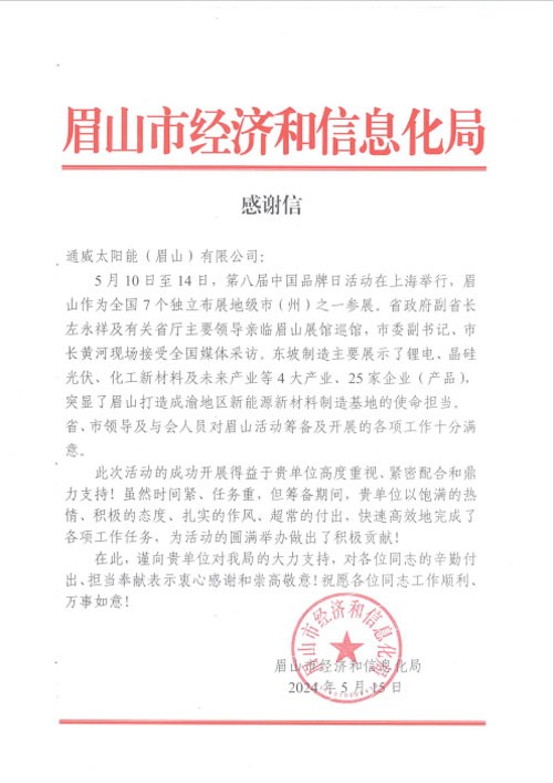 點(diǎn)贊!通威太陽能(眉山)有限公司收到眉山市經(jīng)濟(jì)和信息化局感謝信