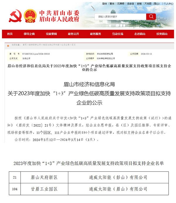 通威太陽能眉山基地、彭山基地雙雙榮獲眉山市“1+3”產(chǎn)業(yè)高質(zhì)量發(fā)展政策支持