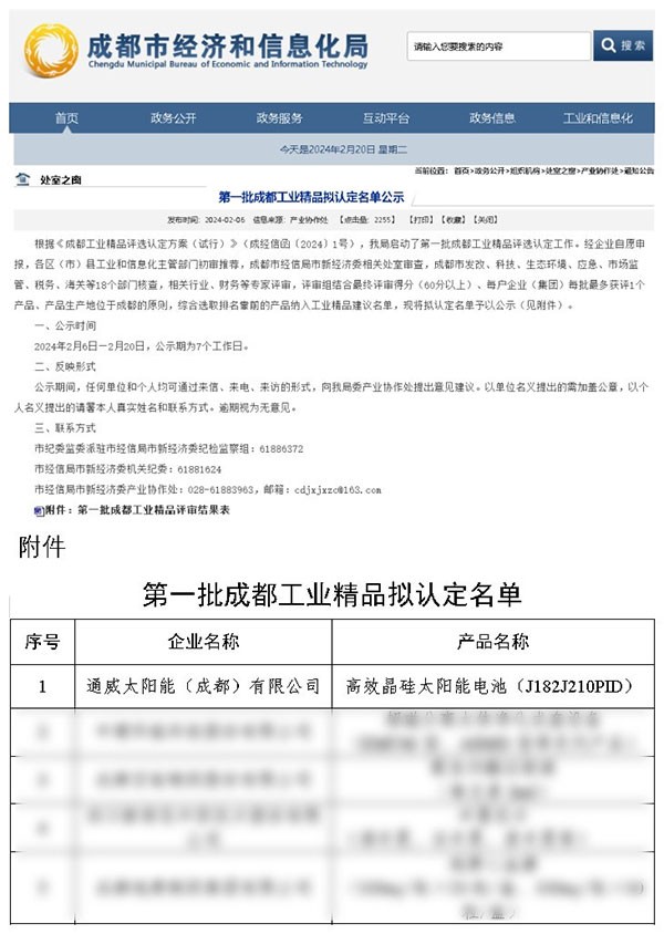 通威太陽能雙流基地榮獲“第一批成都工業(yè)精品”稱號