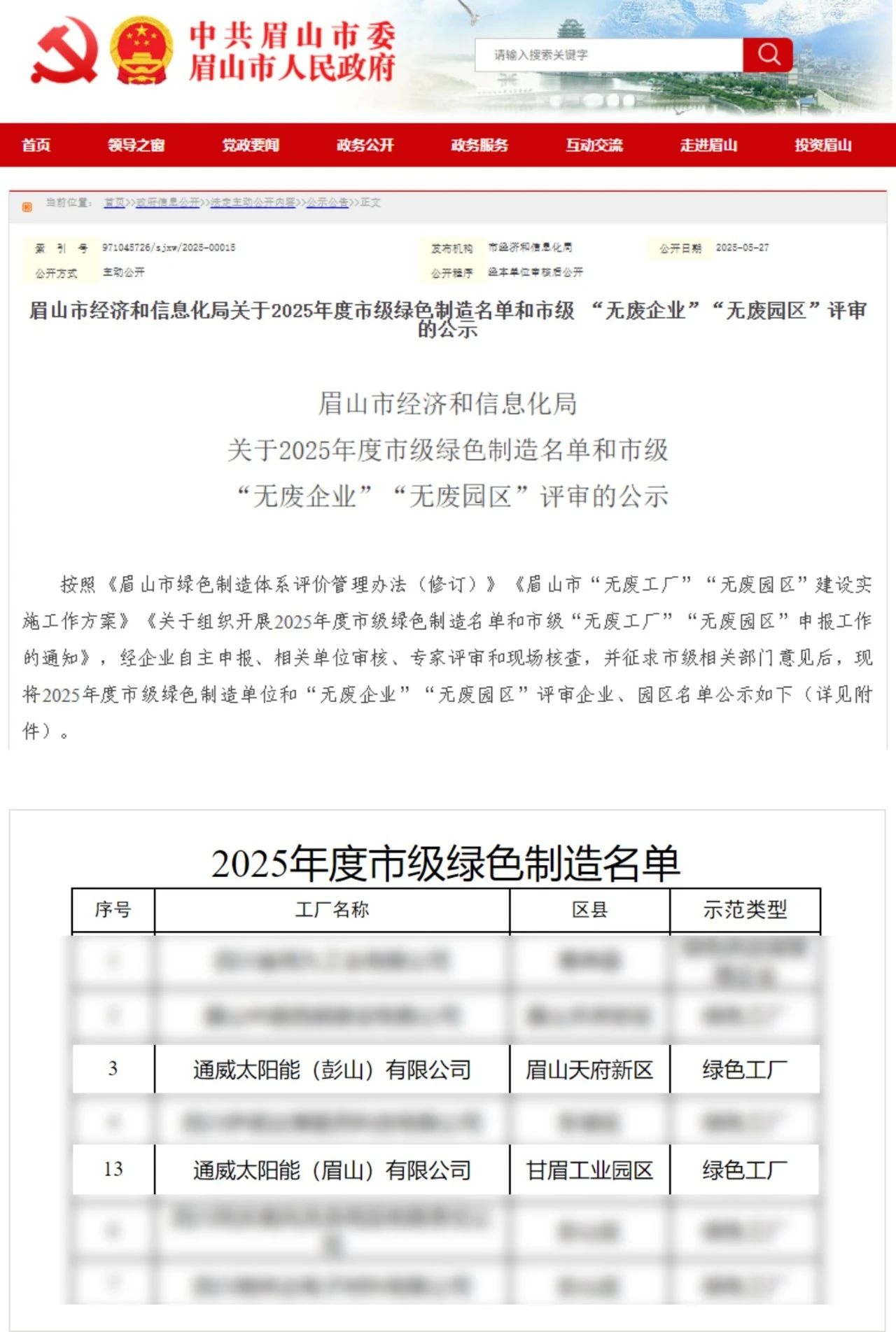 通威太陽能眉山公司、彭山公司雙雙榮獲“眉山市綠色工廠”稱號