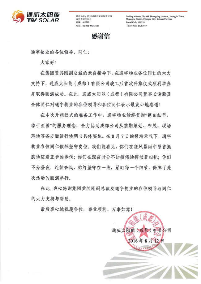 通宇物業獲通威太陽能(成都)有限公司感謝信表揚