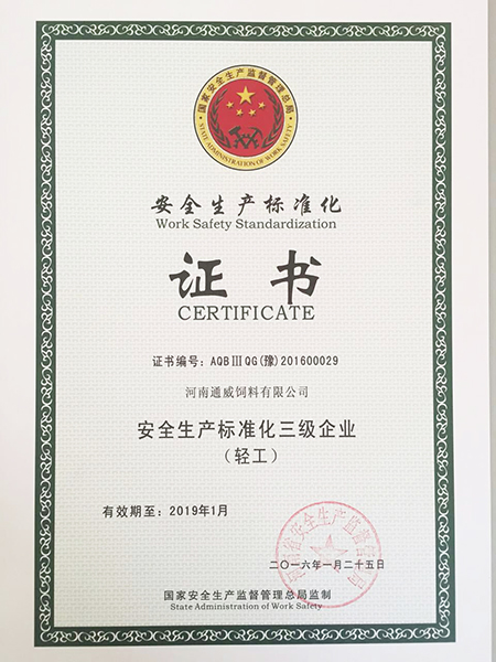 河南通威獲“安全生產(chǎn)標(biāo)準(zhǔn)化三級企業(yè)”證書