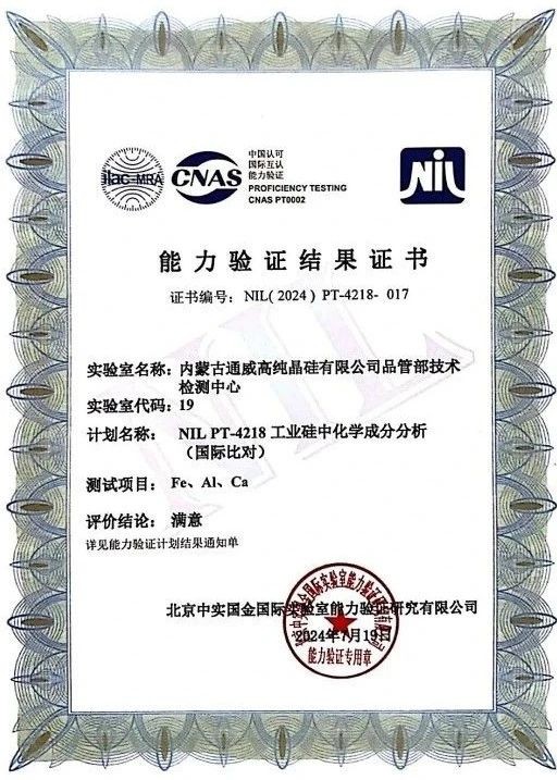 內蒙古通威工業硅化學成分分析獲得國家專業機構認可