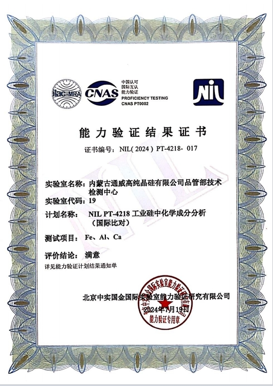 近期,內蒙古通威分析檢測中心接到北京中實國金能力驗證實驗室能力驗證結果的通知,內蒙古通威分析檢測中心參加的“NIL PT-4218 工業硅中化學成分分析(國際比對)”能力驗證結果為滿意,并授予結果證書,表明內蒙古通威分析檢測中心“工業硅化學成分分析”能力獲得國家認可。