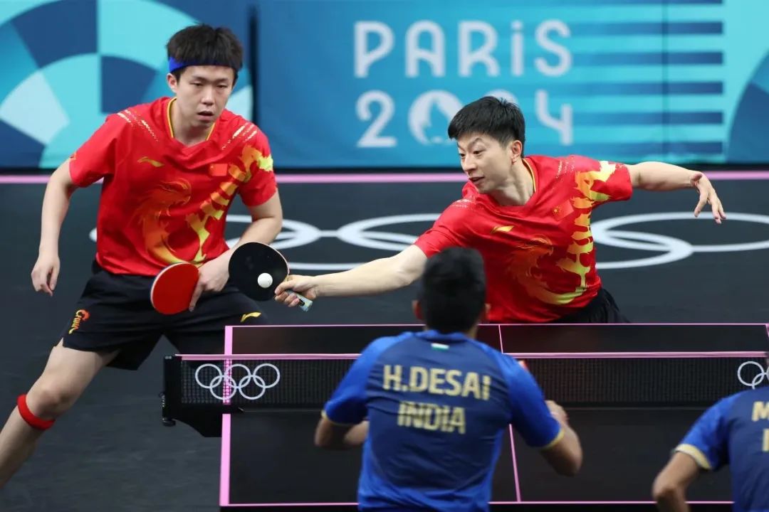 當?shù)貢r間8月6日,中國組合馬龍(上右)/王楚欽在巴黎奧運會乒乓球男團16強賽比賽中。新華社記者 劉續(xù)攝