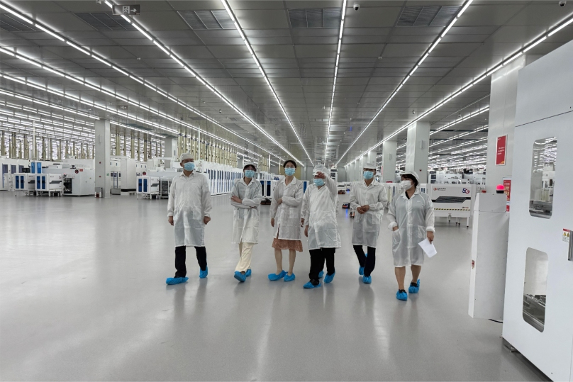 隨后,調研組一行參觀了通合新能源電池智能制造車間。通過現場觀摩5G智能大屏、IGV小車、機械臂等先進智能化設備及系統的實際運行,對從硅片到太陽能電池片的整個生產流程有了直觀的了解。最后,調研組對通合新能源積極響應政府號召、加速項目建設給予了高度評價,并稱贊公司為金堂縣打造了一張數字化、智能化的新名片。