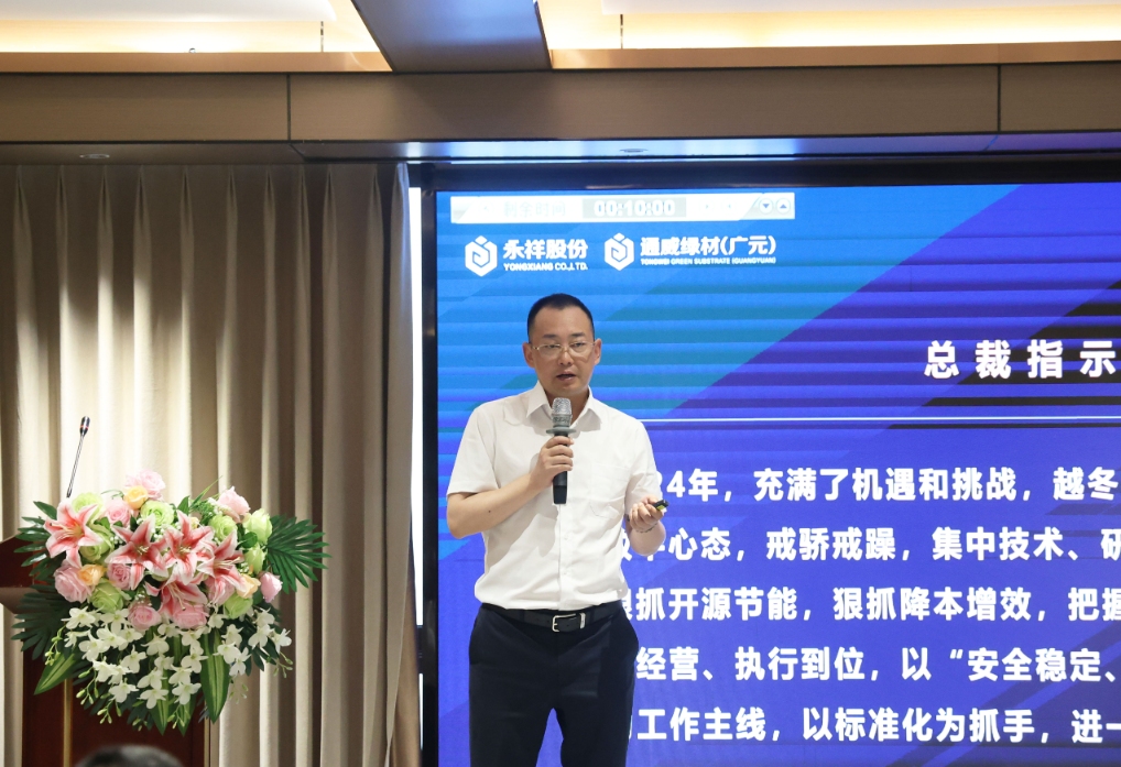 2024年上半年已告一段落,本次總結(jié)會的召開是通威綠材(廣元)新的起點,陳總號召全體廣通綠材人必須時刻保持緊迫感,瞄準(zhǔn)目標(biāo)、鉚足干勁,擼起袖子加油干,為創(chuàng)造社會價值、實現(xiàn)個人價值而堅定信心,賡續(xù)奮斗。