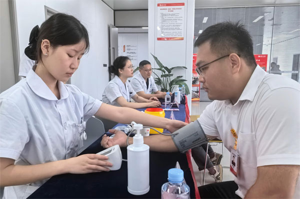 醫(yī)護(hù)人員為員工們免費(fèi)測(cè)量血壓