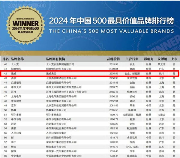 通威榮獲2024年《中國500最具價值品牌》