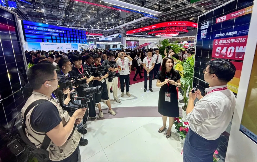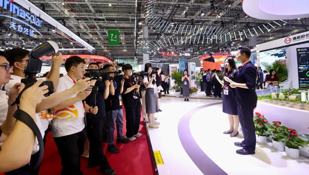 在通威展臺上的通威光伏產業鏈產品吸引了眾多媒體探展“打卡”。華夏雙碳能源研究院、世紀新能源網、光伏們、華夏能源網、北極星太陽能光伏網、能見、中國能源產業發展網等10家媒體,現場采訪通威光伏產業鏈上中下游相關負責人,全面了解通威高效光伏產品和領先技術實力。