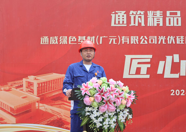5月28日,通威綠材(廣元)廠前區主體結構全面封頂,標志著項目建設取得了極為重要的階段性成果。項目指揮長陳雪剛,指揮長助理邱正剛、王躍以及相關專業負責人和施工方代表共同見證了這一振奮人心的時刻。