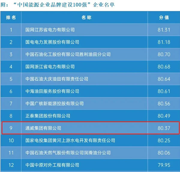 近日,中國能源研究會在第二屆“510中國品牌日·能源產業品牌宣傳周”活動上隆重發布我國首個《中國能源企業品牌建設指數》。根據研究分析數值,得出了“中國能源企業品牌建設100強”企業。其中,通威集團榮列百強榜并名列前十。