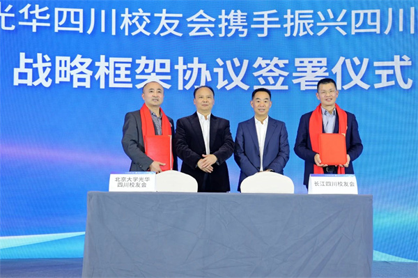 聯(lián)誼會(huì)期間,作為北大光華四川校友會(huì)會(huì)長(zhǎng),劉漢元主席與長(zhǎng)江商學(xué)院四川校友會(huì)會(huì)長(zhǎng)黃明良共同上臺(tái)見(jiàn)證,北京大學(xué)光華四川校友會(huì)秘書(shū)長(zhǎng)劉京安和長(zhǎng)江四川校友會(huì)副會(huì)長(zhǎng)兼秘書(shū)長(zhǎng)陳建偉分別代表雙方在現(xiàn)場(chǎng)簽署了戰(zhàn)略合作框架協(xié)議。未來(lái)雙方將攜手前進(jìn),共同為振興四川經(jīng)濟(jì)積極貢獻(xiàn)智慧和力量。