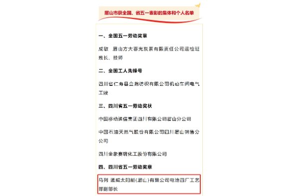 通威太陽能(眉山)有限公司電池四廠工藝部副部長馬列榮獲“四川省五一勞動獎章”表彰