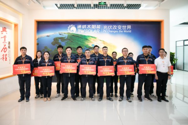 近日,通威太陽能科技成功舉行2024年第一季度TQM頒獎儀式。通威股份總裁助理、通威太陽能科技有限公司總經理蕭圣義,通威太陽能(鹽城)有限公司副總經理翟緒錦,通威太陽能(合肥)有限公司總經理助理李冬生,通威太陽能(四川)有限公司總經理助理朱劍誠,通威太陽能科技南通基地相關負責人出席活動并為獲獎代表頒獎。