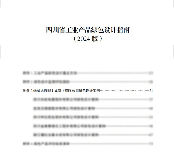 為加快推動綠色產品開發和認證,進一步夯實全省工業綠色本底,提升“四川制造”工業產品綠色競爭優勢,助力構建綠色低碳循環發展經濟體系,省經濟和信息化廳聯合省市場監管局組織編制了《四川省工業產品綠色設計指南(2024版)》,通威太陽能(成都)有限公司榮列其中。
