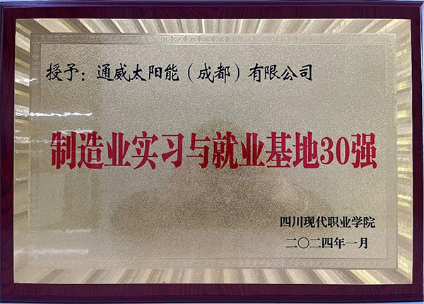 通威太陽能雙流基地獲授四川現(xiàn)代職業(yè)學(xué)院“制造業(yè)實習(xí)與就業(yè)基地30強”