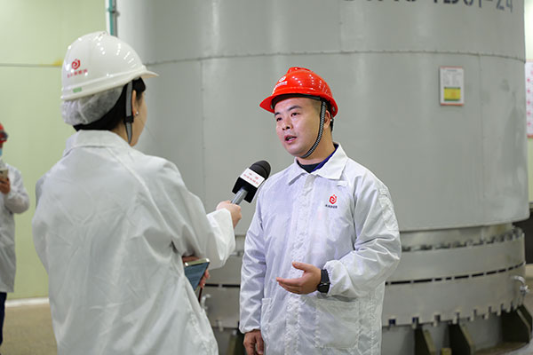 在永祥新能源還原二工段還原大廳,記者一行詳細詢問了晶硅的生產(chǎn)工藝、公司的科研創(chuàng)新情況,并對永祥的發(fā)展歷程、生產(chǎn)運行情況、能耗指標等進行了細致了解。官部長對央視記者一行的到訪表示熱烈歡迎,并表示,通威歷經(jīng)40多年的發(fā)展,已經(jīng)形成了完整的新能源產(chǎn)業(yè)鏈。永祥股份一直以來始終堅持“綠色工廠生產(chǎn)綠色產(chǎn)品”的環(huán)保理念,通過技術(shù)創(chuàng)新,不斷夯實行業(yè)龍頭地位。目前永祥自主研發(fā)的“永祥法”已應用至第八代,研發(fā)儲備至第九代,產(chǎn)品純度高達11個9,真正實現(xiàn)了高純晶硅中國“智造”。