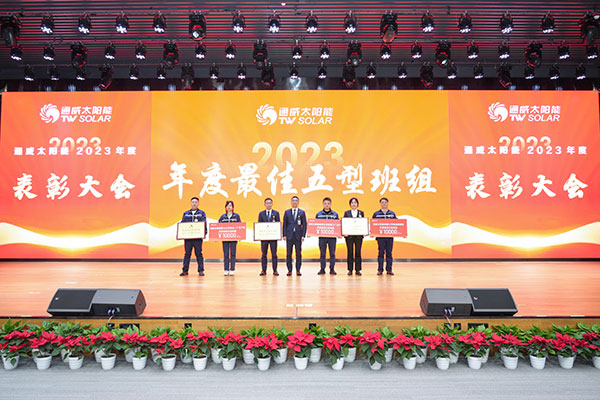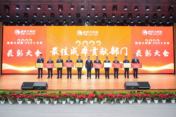 表彰現場,周總對獲獎的員工及團隊表示祝賀,并對奮斗在一線的每一位通威家人表示衷心的感謝。他表示,2023年,通威太陽能公司在全體員工的共同努力下取得了顯著的成績,接下來的2024年是頗具機遇以及挑戰的一年,要始終保持戰戰兢兢,如履薄冰的工作精神,強化責任意識,多用放大鏡找自己的缺點,多用放大鏡看別人的優點,讓各項競爭力指標都在行業里做到遙遙領先。