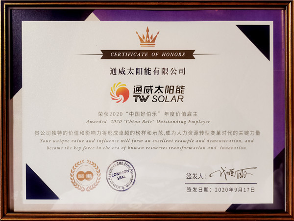 9月17日,由全球領先的人力資源共享平臺——伯樂會所發起的2020“微轉型·創生態-人力資源高管年會”暨2020“中國好伯樂”系列頒獎盛典在上海隆重舉行。通威太陽能歷經伯樂會專家評審團長達數月的審核、調研與考察,最終脫穎而出榮膺2020“中國好伯樂”年度價值雇主大獎。