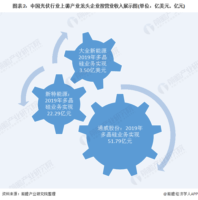 在國內多晶硅市場,大全新能源、新特能源以及通威股份等龍頭企業在2019年實現了較好收入。其中,大全新能源2019年多晶硅業務實現3.5億美元營收;新特能源的多晶硅業務實現22.29億元以及通威股份實現51.79億元的營收。