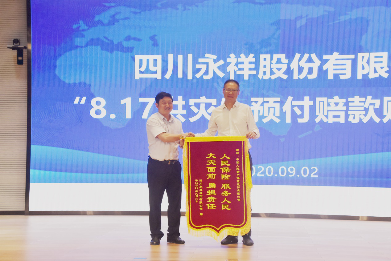 9月2日,中國人民財產保險股份有限公司向永祥股份有限公司預付賠款賠付儀式在永祥新能源報告廳成功舉行。樂山市金融工作局副局長余強、市銀保監分局副局長陳光忠,中國人民財產保險股份有限公司四川省公司副總經理宋科、首席核賠師彭世隆,通威股份董事、永祥股份董事長兼總經理段雍,永祥股份財務總監袁仕華,永祥股份副總經理兼永祥多晶硅總經理杜炳勝等領導出席。