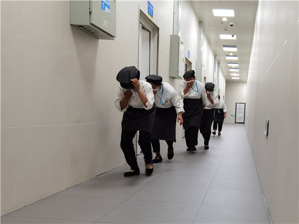 演練模擬食堂熱灶間由于線路故障突發(fā)火災(zāi)事故,煙霧迅速蔓延,食堂工作人員發(fā)現(xiàn)火情立即關(guān)閉風(fēng)機(jī)、切斷電源使用滅火器進(jìn)行了初期滅火,并匯報食堂管理人員。隨后,食堂管理人員迅速組織工作人員就近使用水浸濕毛巾,捂住口鼻,井然有序的疏散至安全地帶,同時對火災(zāi)現(xiàn)場進(jìn)行滅火、警戒。最終,火災(zāi)被撲滅,無人員傷亡,演練圓滿結(jié)束。