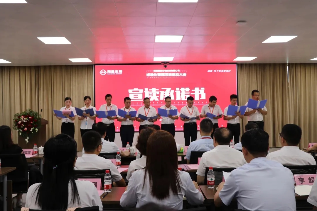 會上,蔡總回顧了南昌生物發(fā)展歷程,并表示,公司高度重視并積極響應(yīng)標(biāo)準(zhǔn)化管理項目工作,進(jìn)一步打造成行業(yè)標(biāo)桿,并將持續(xù)為通威股份農(nóng)牧板塊跨越式增長貢獻(xiàn)力量。南昌生物總經(jīng)理助理蔣志軍宣讀南昌生物公司標(biāo)準(zhǔn)化管理項目組組織架構(gòu)和任命書,蔡總帶領(lǐng)各部門經(jīng)理宣讀承諾書。