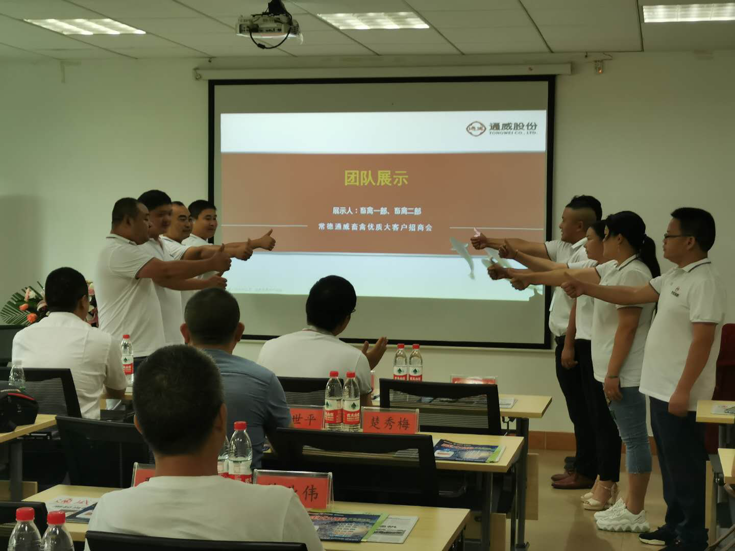 在整齊的通威集結號中,會議拉開了序幕。常德通威的畜禽營銷精英們用精彩的團隊展示表達了對客戶的熱烈歡迎!嘹亮的口號喊出了畜禽團隊的激情和氣勢,一首《走在大路上》展現(xiàn)了他們披荊斬棘向前進的精神和勇氣!