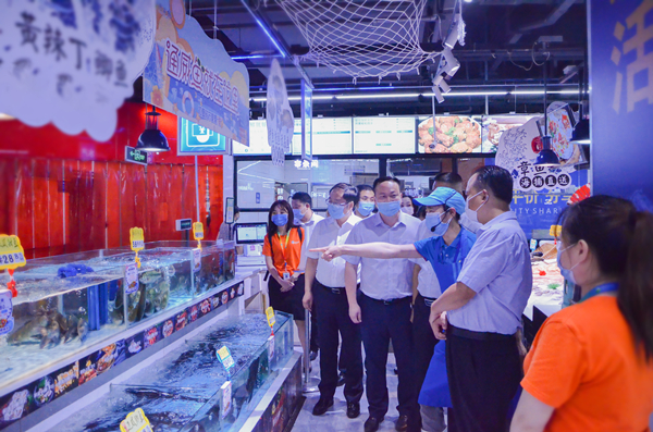 劉主席走訪并詳細(xì)詢問了通威三聯(lián)水產(chǎn)市場的整體運營情況,了解疫情對水產(chǎn)批發(fā)行情的影響,對水產(chǎn)批發(fā)環(huán)節(jié)的食品安全問題和信息化相關(guān)工作表示關(guān)切。同時,劉主席一行深入通威魚品質(zhì)提升車間和園區(qū)辦公區(qū)域,現(xiàn)場查看各環(huán)節(jié)運行狀況,全面了解了產(chǎn)品入園、檢測、電化水透析凈養(yǎng)、打包、發(fā)貨及加工全供應(yīng)鏈運轉(zhuǎn)流程,對部分產(chǎn)品外觀形態(tài)、產(chǎn)品陳列方式、食品安全保障措施提出了進(jìn)一步改善建議。