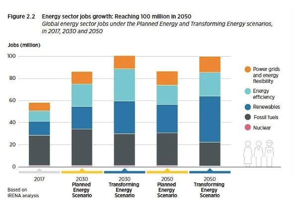 報告顯示,為了實現能源系統的深度去碳化,雖然需要新投約130萬億美元,但這類投資的社會經濟收益將是巨大的。從現在到2050年,與常規情境相比,能源系統的轉型能使全球GDP多增加98萬億美元,并且將使可再生能源產業的就業增加近三倍,達到4200萬個,并推動能源效率相關的就業機會增加到2100萬,電網靈活性相關的就業增加到1500萬個。