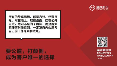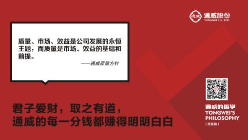 “養殖效益最大化”必須是發自內心的真話,必須成為每個通威人的行為準則。換個花樣就多賺用戶的錢,這都是短視的、小兒科的手段!不被浮云遮眼,才是一個高智商的企業與員工應該做的事情。要公道,打顛倒,站在用戶的角度上考慮問題,打開大門讓用戶把每個環節看完,回去依舊覺得通威是他的唯一選擇。任何時候要搞清楚,用戶的麻煩是企業的麻煩,企業的麻煩是用戶的麻煩,我們的合作就像在一條船上,額外花的錢、費的功夫、停的機器、浪費的工時、加工出來的次品,一定是共同買單。我賺不到錢,無法為你服務;我賺多了錢,明天你不讓我為你服務!我們的合作如果浪費太多時間和資源,我們的聯合就沒有意義,最終崩塌。”