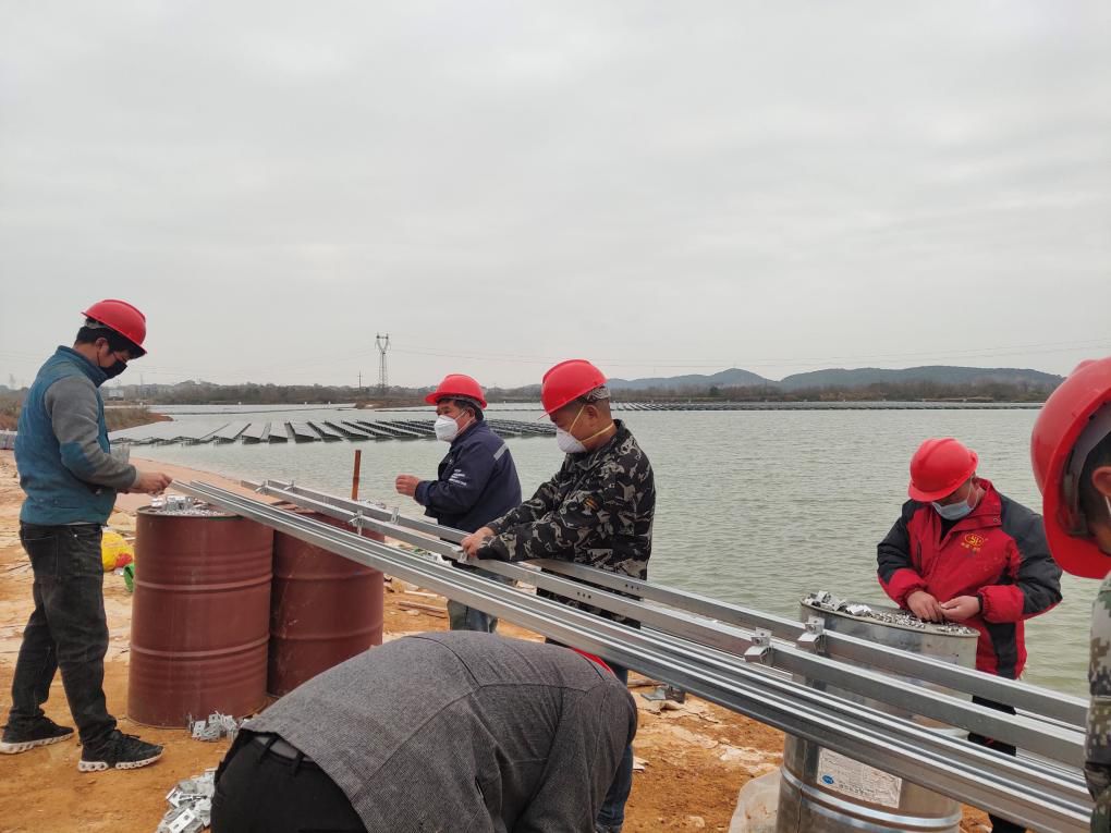 恢復施工當日,項目部認真檢查了防疫物資準備情況和個人防控用品使用情況,體溫檢測、人員信息登記、安全消殺工作有序開展。隨后,全體復工施工人員由項目經(jīng)理統(tǒng)一進行現(xiàn)場防疫安全培訓,詳細講解項目現(xiàn)場對施工單位及個人防控的要求,嚴格執(zhí)行項目部防疫管控,正式開展項目現(xiàn)場光伏區(qū)浮體安裝、組件安裝工作。高安項目于2019年11月1日正式開工,2019年12月31日首次并網(wǎng)發(fā)電,目前計劃完成建設的工程量為80MW。正式復工后,面對天氣的不利影響,高安項目巧用心思,在施工場地鋪上了紙板,施工上做到不掉線。