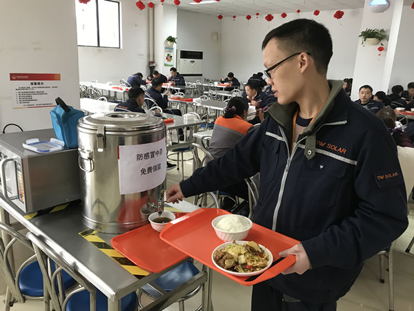 為統籌調度合肥、成都、眉山三地防控工作,通威太陽能開設專項溝通群,第一時間溝通防控措施。安排專人對公共區域、餐廳進行定期消毒管理,并為各車間及行政樓配備免洗消毒洗手液;及時補充購置N95型口罩,并發放到每位員工手中;公司班車安排專項巴氏消毒,并準備一次性防護口罩發放給乘車員工;公司辦公區域空調調整為換氣模式,循環室內空氣;對在崗員工進行每日2次體溫測量,對外來人員進行體溫測量準入,對班車乘車人員進行入車體溫測量,做到體溫異常人員早發現、早治療;收集相關疫情信息和防護知識,積極進行內部宣導。