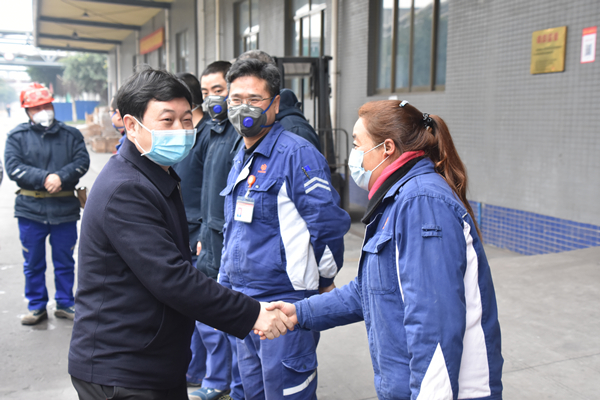 永祥股份董事長兼總經理段雍向堅守崗位的員工送上節日祝福