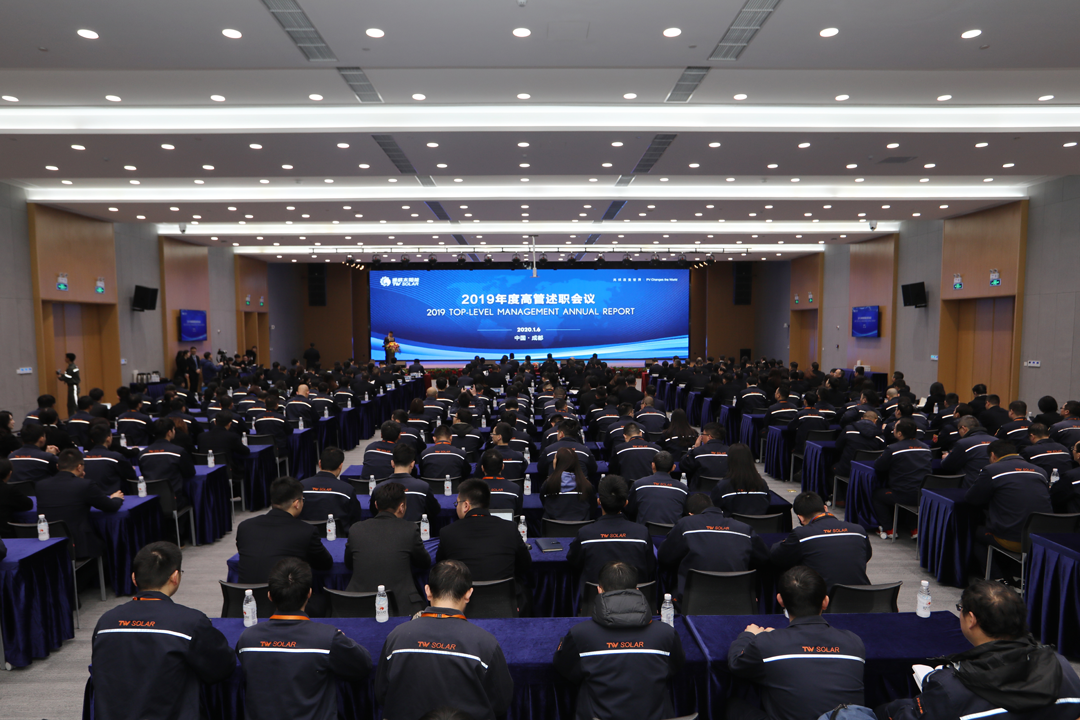 1月6日,通威太陽能2019年度高管述職會在成都基地報告廳隆重舉行,十一屆全國政協常委、全國人大代表、通威集團董事局劉漢元主席出席并作重要指示,通威股份光伏事業部總裁陳星宇、監事會主席鄧三等出席會議。通威股份董事長謝毅、通威太陽能全體高管作2019年度述職報告,成都、合肥基地500余名中高管及員工代表現場及視頻參會。