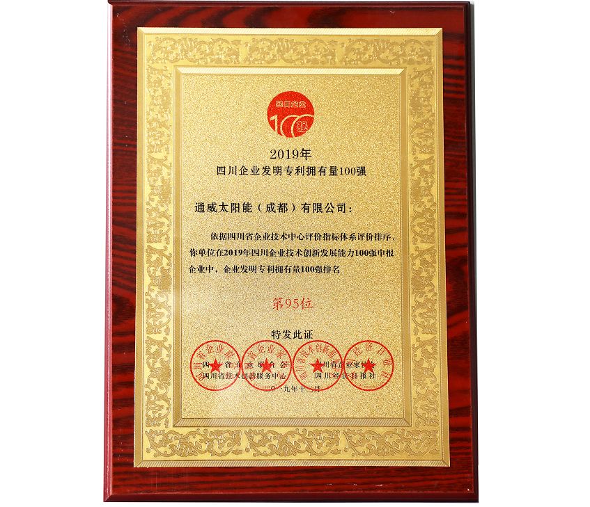 通威太陽能成都公司一舉榮獲“四川企業(yè)技術創(chuàng)新研發(fā)經費投入100強企業(yè)”、“四川企業(yè)發(fā)明專利擁有量100強企業(yè)”兩項殊榮。