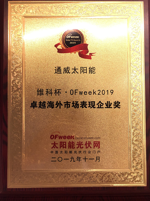 11月21日,由OFweek維科網主辦的“維科杯·OFweek 2019中國太陽能光伏行業年度評選”活動在深圳圓滿落幕。在近百家光伏企業參與評選的激烈競爭中,通威太陽能以超卓成績,斬獲“維科杯·OFweek 2019卓越海外市場表現企業獎”及“維科杯·OFweek 2019卓越光伏電池產品獎”兩大殊榮。