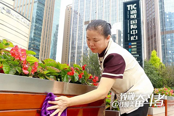 47歲的李茂群每天上班要騎20多分鐘自行車,入職通宇物業(yè)4年半以來,風雨無阻。她一般早上7點之前就到崗,第一件事就是做大樓外圍的清掃工作。