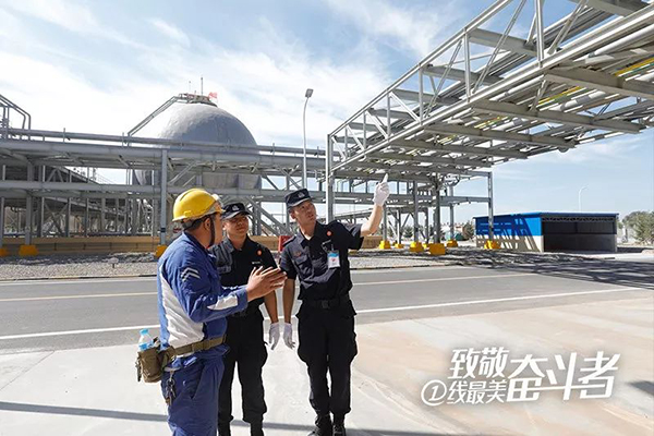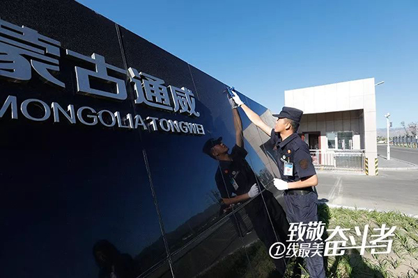 在2號門,魏志龍提醒執勤人員拿兩條毛巾,一起擦起了刻有廠名的墻壁,并叮囑他:“每天不要只擦一次,風沙大。”大門的衛生、車輛秩序,員工著裝規范都是他們的工作職責。看完各大門,魏志龍繼續巡查廠內重點區域,這種巡查會持續到晚上及凌晨夜班。基地面積800多畝,為了保證基地安全,物業秩序隊22人,每天24小時不間斷要巡邏7次,每天至少3萬步。