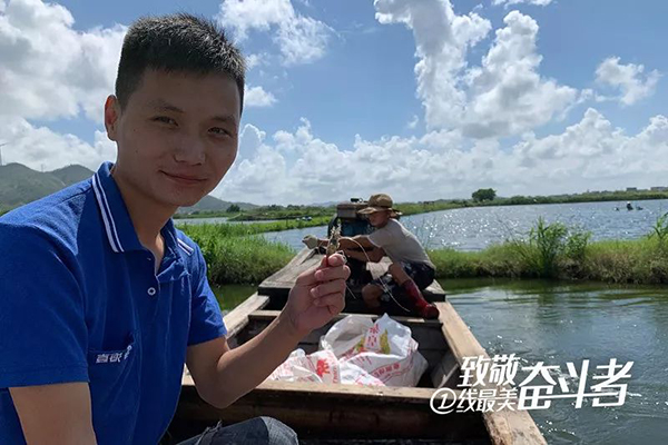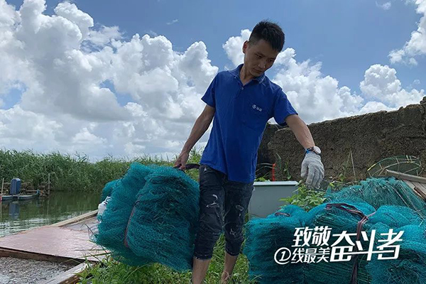 上午10點(diǎn),氣溫升到36℃ ,一位養(yǎng)殖戶正要收蝦?!罢梦襾?lái)幫你收,順便看看吃了通威料的蝦長(zhǎng)得怎么樣了?!闭f(shuō)罷,朱俊杰熟練地戴上遮陽(yáng)帽和手套,換上塑料拖鞋,挽起褲腿,騎著摩托車穿過(guò)崎嶇的塘間小路,跳上了收蝦的小船。“我們?cè)诎菰L養(yǎng)殖戶的同時(shí),常常幫助他們做一些力所能及的事情,不僅是做客情,增進(jìn)對(duì)養(yǎng)殖戶了解,同時(shí)也是不斷學(xué)習(xí)、不斷實(shí)踐的過(guò)程?!豹M窄的小船蕩漾在波光粼粼的水面上,朱俊杰配合養(yǎng)殖戶從塘里收起了一籠一籠的蝦。