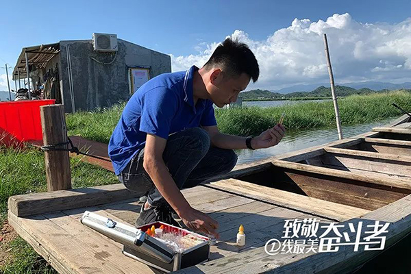 粵東8月的陽(yáng)光與塘頭的暑氣令人眩暈,收蝦結(jié)束的時(shí)候臨近中午,我們跟隨朱俊杰在塘頭暴曬了兩個(gè)多小時(shí),汗流浹背、頭皮發(fā)燙。下午3點(diǎn),他又頂著烈日酷暑為客戶做測(cè)水實(shí)驗(yàn)。