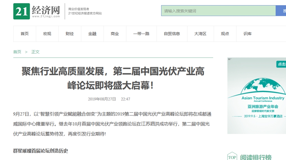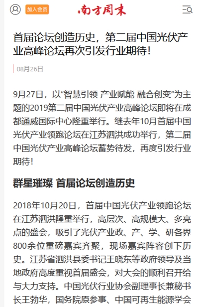 近兩日,光伏行業(yè)被一條重磅新聞點(diǎn)燃:9月27日,以“智慧引領(lǐng) 產(chǎn)業(yè)賦能 融合創(chuàng)變”為主題的2019第二屆中國光伏產(chǎn)業(yè)高峰論壇即將在成都通威國際中心隆重舉行。這是繼去年10月首屆中國光伏產(chǎn)業(yè)領(lǐng)跑論壇在江蘇泗洪成功舉行后,再度舉辦。消息一經(jīng)公布,立即引發(fā)行業(yè)和媒體關(guān)注。包括南方周末、時(shí)代周報(bào)、長江商報(bào)等主流媒體,21世紀(jì)經(jīng)濟(jì)報(bào)道、中國經(jīng)營報(bào)、金融投資報(bào)等財(cái)經(jīng)媒體,索比光伏網(wǎng)、黑鷹光伏、PV News、光伏新聞等行業(yè)媒體,數(shù)十家媒體對第二屆中國光伏產(chǎn)業(yè)高峰論壇即將召開的消息進(jìn)行了聚焦報(bào)道。