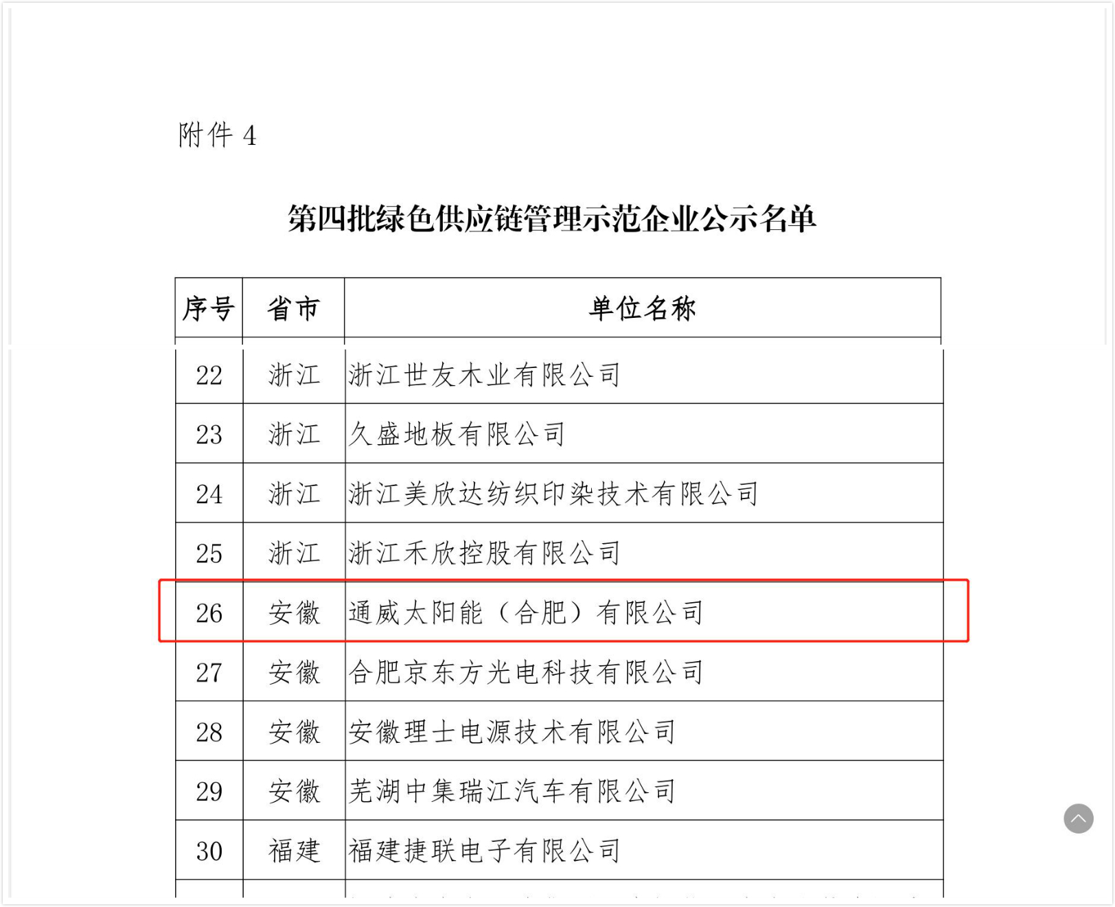7月18日,國家工業(yè)和信息化部公布了第四批綠色制造公示名單,共評選出國家綠色工廠611家,國家綠色供應鏈管理示范企業(yè)50家。通威太陽能合肥公司榮列兩項榜單,成為安徽省唯一一家同時入選國家綠色工廠、國家綠色供應鏈管理示范企業(yè)的單位。