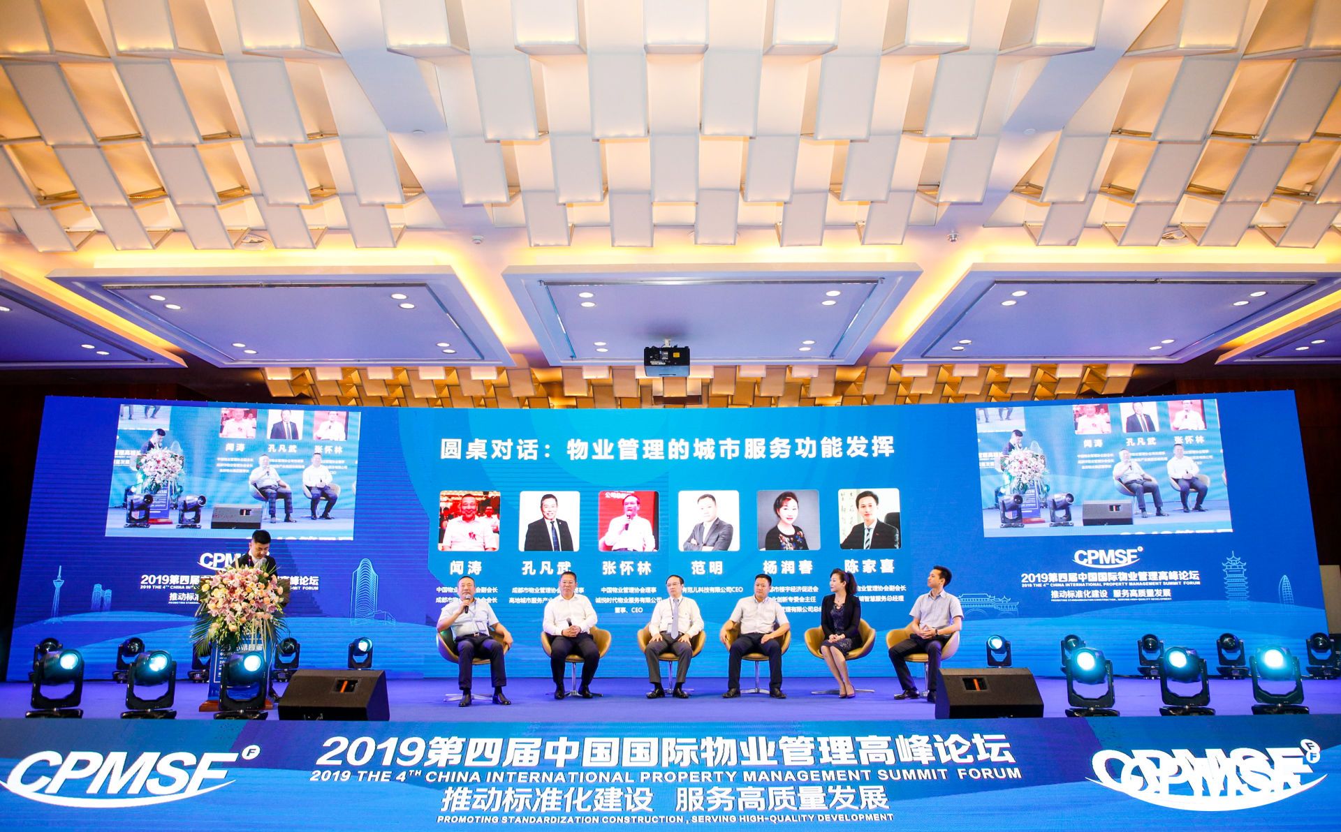 在圓桌對(duì)話環(huán)節(jié),中國物業(yè)管理協(xié)會(huì)副會(huì)長(zhǎng)、成都市物業(yè)管理協(xié)會(huì)會(huì)長(zhǎng)聞濤 ,成都市物業(yè)管理協(xié)會(huì)常務(wù)理事、高地城市服務(wù)產(chǎn)業(yè)集團(tuán)總裁助理孔凡武,中國物業(yè)管理協(xié)會(huì)理事、誠悅時(shí)代物業(yè)服務(wù)有限公司董事、CEO張懷林,成都市樓宇經(jīng)濟(jì)促進(jìn)會(huì)物業(yè)創(chuàng)新專委會(huì)主任、云銀城物業(yè)管理有限公司總經(jīng)理?xiàng)顫?rùn)春,成都市物業(yè)管理協(xié)會(huì)副會(huì)長(zhǎng)、成都龍湖智慧服務(wù)總經(jīng)理陳家喜,超有范兒科技有限公司 CEO范明就“物業(yè)管理的城市服務(wù)功能發(fā)揮”話題展開深入探討,為現(xiàn)場(chǎng)觀眾帶來了一場(chǎng)腦力激蕩的思想盛宴。