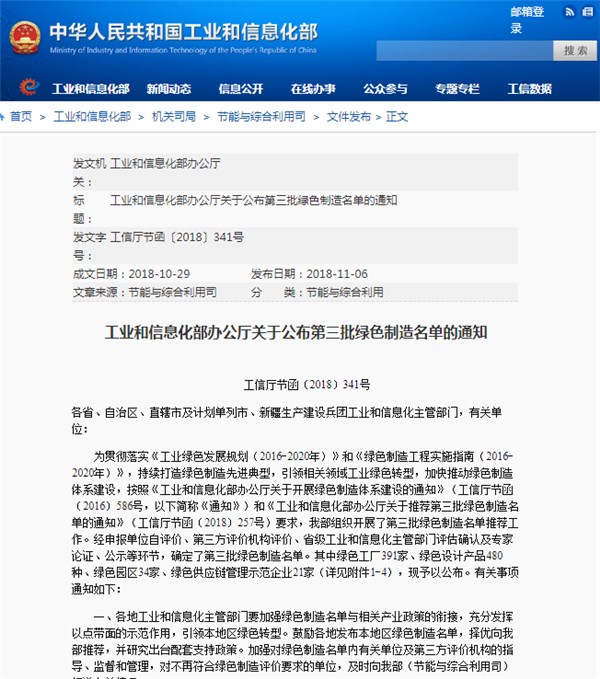 2018年11月6日,國家工業和信息化部公布了第三批綠色制造名單,其中綠色工廠391家、綠色設計產品480種、綠色園區34家、綠色供應鏈管理示范企業21家,通威太陽能(成都)有限公司榮列綠色工廠名單