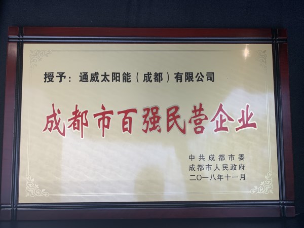 2018年11月24日,成都市民營經濟健康發展大會隆重召開,通威太陽能(成都)有限公司榮獲“成都市百強民營企業”榮譽稱號