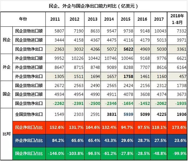 整體而言,2011年至2018年8月,民企的凈出口規(guī)模合計(jì)38978億美元,外企合計(jì)11818億美元,而國企的數(shù)據(jù)令人大開眼界,合計(jì)-19717億美元。我建議各位再認(rèn)真的一個(gè)字一個(gè)字的讀一下這個(gè)數(shù)據(jù):-19717億美元。然后我們再來好好思考一下:國企能不能建立起出口能力?如果國企最終無法建立出口能力,那么,國企還能干什么?